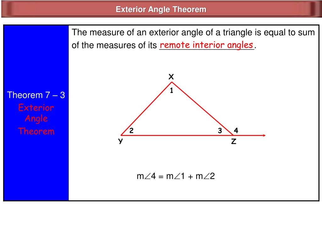 X 1 2 3 4 Y Z Exterior Angle Theorem remote interior angles m4 = m1 + m2