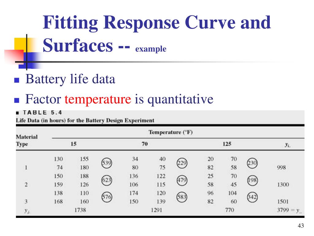 Fitting Response Curve and Surfaces -- example • Battery life data • Factor temperature is quantitative