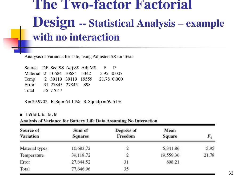 The Two-factor Factorial Design -- Statistical Analysis – example with no interaction Analysis of Variance for Life, using Adjusted SS for Tests Source DF Seq SS Adj SS Adj MS F P Material 2 10684 10684 5342 5.95 0.007 Temp 2 39119 39119 19559 21.78 0.000 Error 31 27845 27845 898 Total 35 77647 S = 29.9702 R-Sq = 64.14% R-Sq(adj) = 59.51%