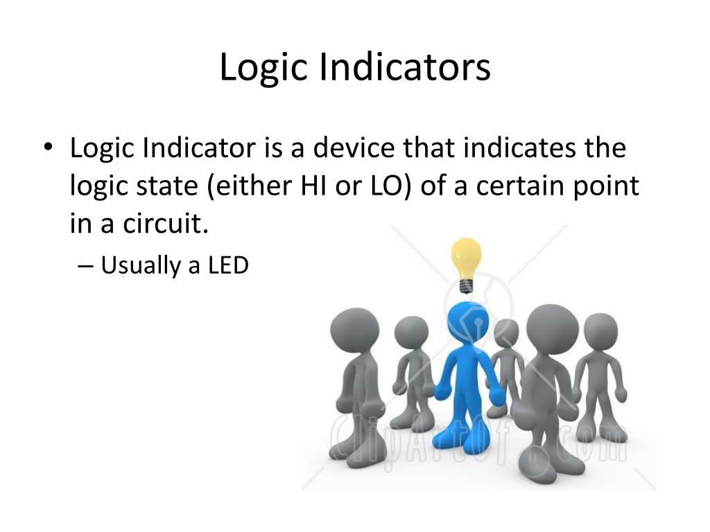 Logic Indicators • Logic Indicator is a device that indicates the logic state (either HI or LO) of a certain point in a circuit. • Usually a LED