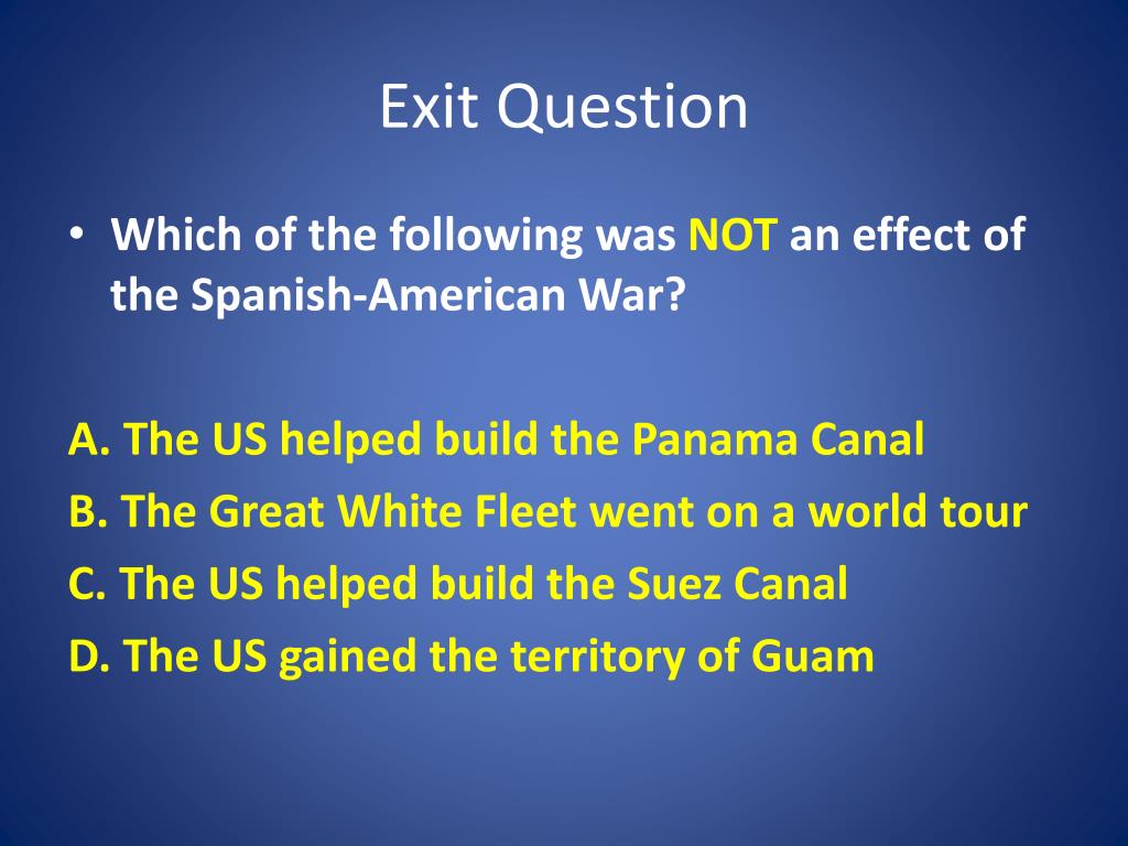 Exit Question • Which of the following was NOT an effect of the Spanish-American War? A. The US helped build the Panama Canal B. The Great White Fleet went on a world tour C. The US helped build the Suez Canal D. The US gained the territory of Guam