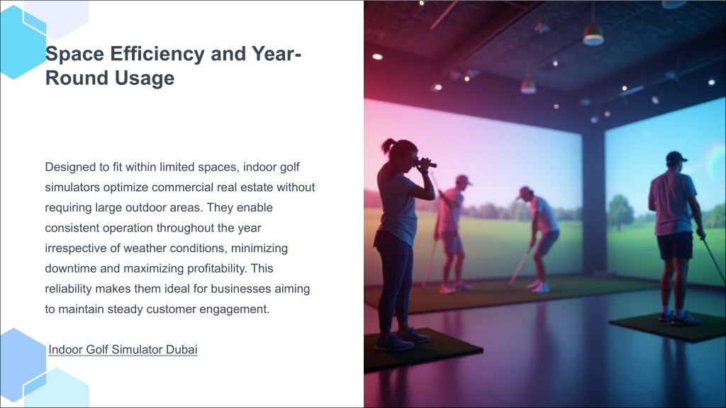 Space Efficiency and Year- Round Usage Designed to fit within limited spaces, indoor golf simulators optimize commercial real estate without requiring large outdoor areas. They enable consistent operation throughout the year irrespective of weather conditions, minimizing downtime and maximizing profitability. This reliability makes them ideal for businesses aiming to maintain steady customer engagement. Indoor Golf Simulator Dubai