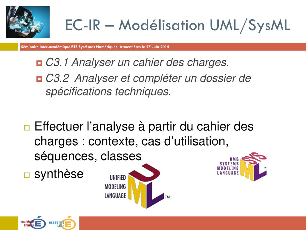 EC-IR – Modélisation UML/SysML • C3.1 Analyser un cahier des charges. • C3.2 Analyser et compléter un dossier de spécifications techniques. • Effectuer l’analyse à partir du cahier des charges : contexte, cas d’utilisation, séquences, classes • synthèse