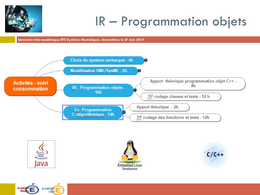 IR – Programmation objets • C3.10 Réaliser la conception détaillée d’un module matériel et/ou logiciel. • C4.4 Développer un module logiciel. • C4.5 Tester et valider un module logiciel et matériel. • C4.6 : intégrer un module logiciel • Réaliser tout ou partie du codage de l’application embarquée en C++, java (approche objets).