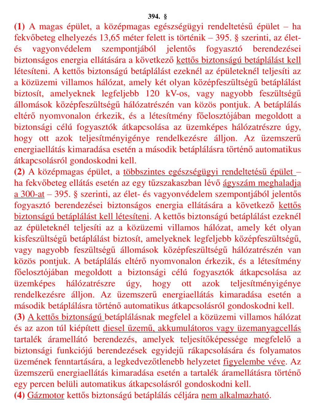 394.§ (1) A magas épület, a középmagas egészségügyi rendeltetésű épület – ha fekvőbeteg elhelyezés 13,65 méter felett is történik – 395. § szerinti, az élet- és vagyonvédelem szempontjából jelentős fogyasztó berendezései biztonságos energia ellátására a következő kettős biztonságú betáplálást kell létesíteni. A kettős biztonságú betáplálást ezeknél az épületeknél teljesíti az a közüzemi villamos hálózat, amely két olyan középfeszültségű betáplálást biztosít, amelyeknek legfeljebb 120 kV-os, vagy nagyobb feszültségű állomások középfeszültségű hálózatrészén van közös pontjuk. A betáplálás eltérő nyomvonalon érkezik, és a létesítmény főelosztójában megoldott a biztonsági célú fogyasztók átkapcsolása az üzemképes hálózatrészre úgy, hogy ott azok teljesítményigénye rendelkezésre álljon. Az üzemszerű energiaellátás kimaradása esetén a második betáplálásra történő automatikus átkapcsolásról gondoskodni kell. (2) A középmagas épület, a többszintes egészségügyi rendeltetésű épület – ha fekvőbeteg ellátás esetén az egy tűzszakaszban lévő ágyszám meghaladja a 300-at – 395. § szerinti, az élet- és vagyonvédelem szempontjából jelentős fogyasztó berendezései biztonságos energia ellátására a következő kettős biztonságú betáplálást kell létesíteni. A kettős biztonságú betáplálást ezeknél az épületeknél teljesíti az a közüzemi villamos hálózat, amely két olyan kisfeszültségű betáplálást biztosít, amelyeknek legfeljebb középfeszültségű, vagy nagyobb feszültségű állomások középfeszültségű hálózatrészén van közös pontjuk. A betáplálás eltérő nyomvonalon érkezik, és a létesítmény főelosztójában megoldott a biztonsági célú fogyasztók átkapcsolása az üzemképes hálózatrészre úgy, hogy ott azok teljesítményigénye rendelkezésre álljon. Az üzemszerű energiaellátás kimaradása esetén a második betáplálásra történő automatikus átkapcsolásról gondoskodni kell. (3)A kettős biztonságú betáplálásnak megfelel a közüzemi villamos hálózat és az azon túl kiépített diesel üzemű, akkumulátoros vagy üzemanyagcellás tartalék áramellátó berendezés, amelyek teljesítőképessége megfelelő a biztonsági funkciójú berendezések egyidejű rákapcsolására és folyamatos üzemének fenntartására, a legkedvezőtlenebb helyzetet figyelembe véve. Az üzemszerű energiaellátás kimaradása esetén a tartalék áramellátásra történő egy percen belüli automatikus átkapcsolásról gondoskodni kell. (4)Gázmotor kettős biztonságú betáplálás céljára nem alkalmazható.