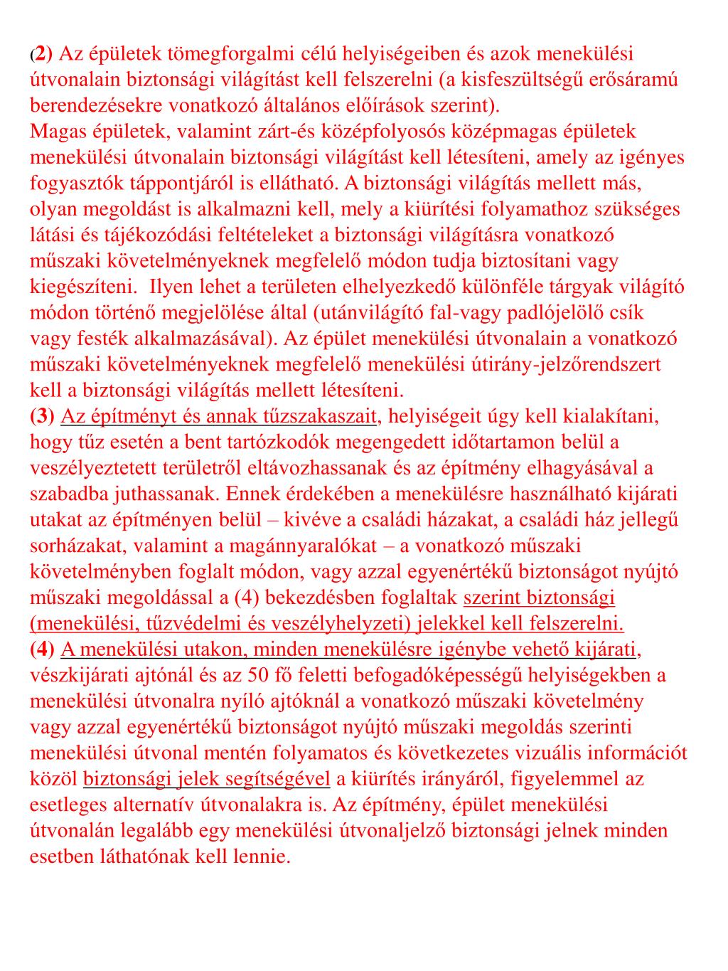 (2) Az épületek tömegforgalmi célú helyiségeiben és azok menekülési útvonalain biztonsági világítást kell felszerelni (a kisfeszültségű erősáramú berendezésekre vonatkozó általános előírások szerint). Magas épületek, valamint zárt-és középfolyosós középmagas épületek menekülési útvonalain biztonsági világítást kell létesíteni, amely az igényes fogyasztók táppontjáról is ellátható. A biztonsági világítás mellett más, olyan megoldást is alkalmazni kell, mely a kiürítési folyamathoz szükséges látási és tájékozódási feltételeket a biztonsági világításra vonatkozó műszaki követelményeknek megfelelő módon tudja biztosítani vagy kiegészíteni. Ilyen lehet a területen elhelyezkedő különféle tárgyak világító módon történő megjelölése által (utánvilágító fal-vagy padlójelölő csík vagy festék alkalmazásával). Az épület menekülési útvonalain a vonatkozó műszaki követelményeknek megfelelő menekülési útirány-jelzőrendszert kell a biztonsági világítás mellett létesíteni. (3) Az építményt és annak tűzszakaszait, helyiségeit úgy kell kialakítani, hogy tűz esetén a bent tartózkodók megengedett időtartamon belül a veszélyeztetett területről eltávozhassanak és az építmény elhagyásával a szabadba juthassanak. Ennek érdekében a menekülésre használható kijárati utakat az építményen belül – kivéve a családi házakat, a családi ház jellegű sorházakat, valamint a magánnyaralókat – a vonatkozó műszaki követelményben foglalt módon, vagy azzal egyenértékű biztonságot nyújtó műszaki megoldással a (4) bekezdésben foglaltak szerint biztonsági (menekülési, tűzvédelmi és veszélyhelyzeti) jelekkel kell felszerelni. (4)A menekülési utakon, minden menekülésre igénybe vehető kijárati, vészkijárati ajtónál és az 50 fő feletti befogadóképességű helyiségekben a menekülési útvonalra nyíló ajtóknál a vonatkozó műszaki követelmény vagy azzal egyenértékű biztonságot nyújtó műszaki megoldás szerinti menekülési útvonal mentén folyamatos és következetes vizuális információt közöl biztonsági jelek segítségével a kiürítés irányáról, figyelemmel az esetleges alternatív útvonalakra is. Az építmény, épület menekülési útvonalán legalább egy menekülési útvonaljelző biztonsági jelnek minden esetben láthatónak kell lennie.