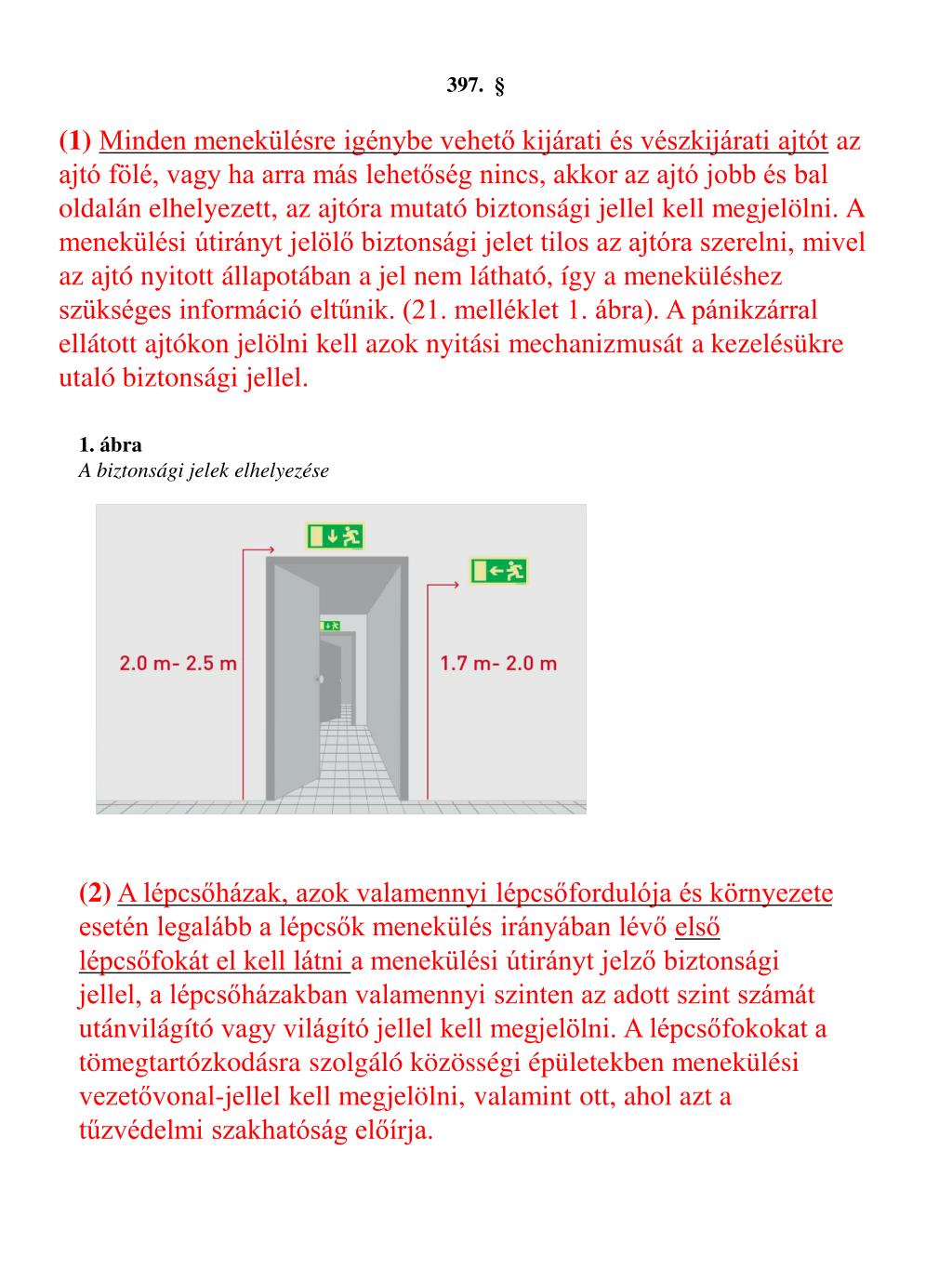 397. § • (1)Minden menekülésre igénybe vehető kijárati és vészkijárati ajtót az ajtó fölé, vagy ha arra más lehetőség nincs, akkor az ajtó jobb és bal oldalán elhelyezett, az ajtóra mutató biztonsági jellel kell megjelölni. A menekülési útirányt jelölő biztonsági jelet tilos az ajtóra szerelni, mivel az ajtó nyitott állapotában a jel nem látható, így a meneküléshez szükséges információ eltűnik. (21. melléklet 1. ábra). A pánikzárral ellátott ajtókon jelölni kell azok nyitási mechanizmusát a kezelésükre utaló biztonsági jellel. 1. ábra A biztonsági jelek elhelyezése (2)A lépcsőházak, azok valamennyi lépcsőfordulója és környezete esetén legalább a lépcsők menekülés irányában lévő első lépcsőfokát el kell látni a menekülési útirányt jelző biztonsági jellel, a lépcsőházakban valamennyi szinten az adott szint számát utánvilágító vagy világító jellel kell megjelölni. A lépcsőfokokat a tömegtartózkodásra szolgáló közösségi épületekben menekülési vezetővonal-jellel kell megjelölni, valamint ott, ahol azt a tűzvédelmi szakhatóság előírja.