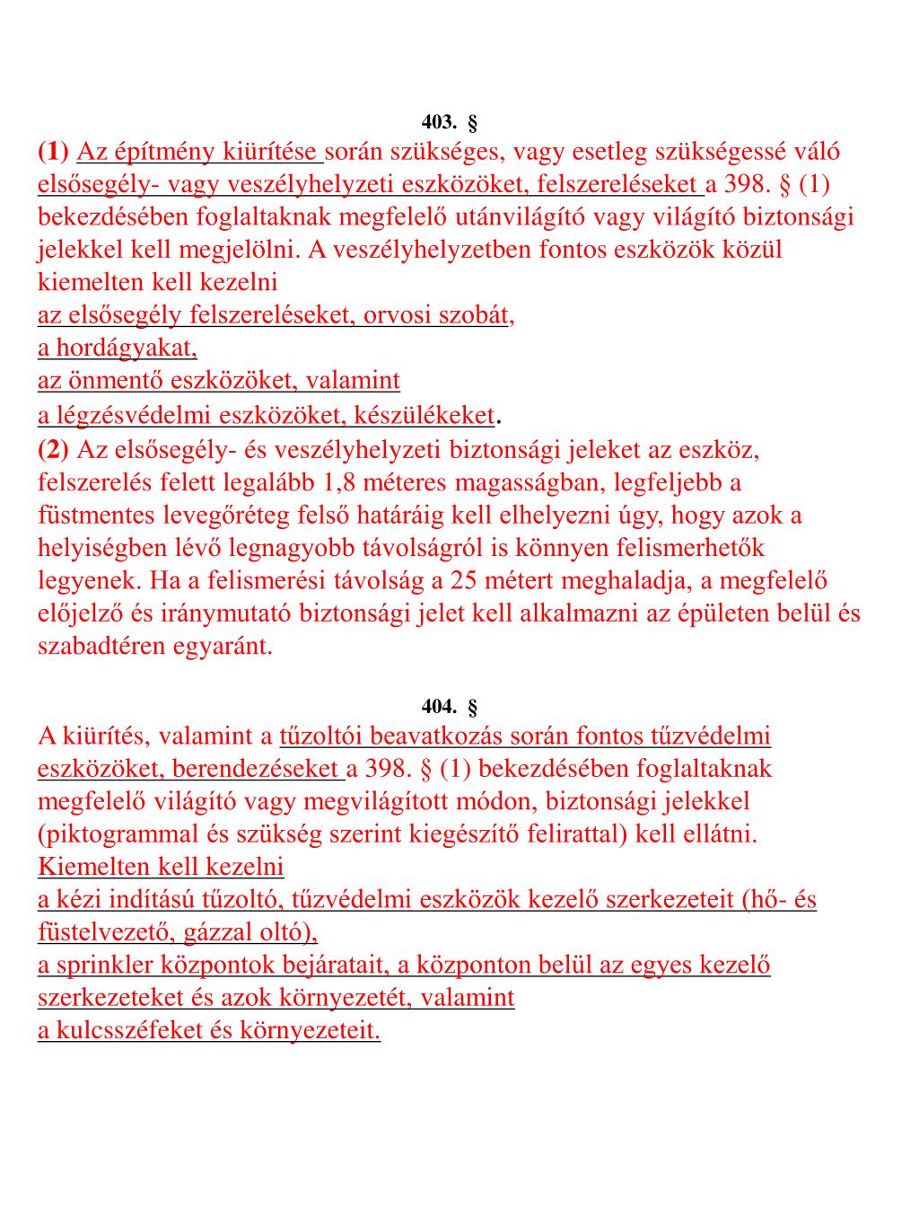 403. § • (1) Az építmény kiürítése során szükséges, vagy esetleg szükségessé váló elsősegély- vagy veszélyhelyzeti eszközöket, felszereléseket a 398. § (1) bekezdésében foglaltaknak megfelelő utánvilágító vagy világító biztonsági jelekkel kell megjelölni. A veszélyhelyzetben fontos eszközök közül kiemelten kell kezelni • az elsősegély felszereléseket, orvosi szobát, • a hordágyakat, • az önmentő eszközöket, valamint • a légzésvédelmi eszközöket, készülékeket. • (2) Az elsősegély- és veszélyhelyzeti biztonsági jeleket az eszköz, felszerelés felett legalább 1,8 méteres magasságban, legfeljebb a füstmentes levegőréteg felső határáig kell elhelyezni úgy, hogy azok a helyiségben lévő legnagyobb távolságról is könnyen felismerhetők legyenek. Ha a felismerési távolság a 25 métert meghaladja, a megfelelő előjelző és iránymutató biztonsági jelet kell alkalmazni az épületen belül és szabadtéren egyaránt. • 404. § • A kiürítés, valamint a tűzoltói beavatkozás során fontos tűzvédelmi eszközöket, berendezéseket a 398. § (1) bekezdésében foglaltaknak megfelelő világító vagy megvilágított módon, biztonsági jelekkel (piktogrammal és szükség szerint kiegészítő felirattal) kell ellátni. Kiemelten kell kezelni • a kézi indítású tűzoltó, tűzvédelmi eszközök kezelő szerkezeteit (hő- és füstelvezető, gázzal oltó), • a sprinkler központok bejáratait, a központon belül az egyes kezelő szerkezeteket és azok környezetét, valamint • a kulcsszéfeket és környezeteit.