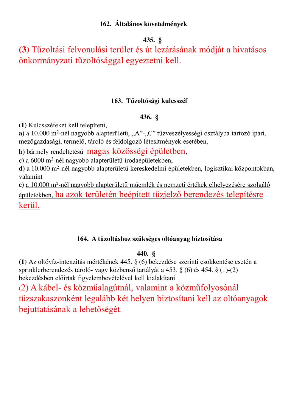 162. Általános követelmények • 435. § • (3) Tűzoltási felvonulási terület és út lezárásának módját a hivatásos önkormányzati tűzoltósággal egyeztetni kell. • 163. Tűzoltósági kulcsszéf • 436. § • (1) Kulcsszéfeket kell telepíteni, • a) a10.000 m2-nél nagyobb alapterületű, „A”-„C” tűzveszélyességi osztályba tartozó ipari, mezőgazdasági, termelő, tároló és feldolgozó létesítmények esetében, • b) bármely rendeltetésű magas közösségi épületben, • c) a 6000 m2-nél nagyobb alapterületű irodaépületekben, • d) a 10.000 m2-nél nagyobb alapterületű kereskedelmi épületekben, logisztikai központokban, valamint • e) a 10.000 m2-nél nagyobb alapterületű műemlék és nemzeti értékek elhelyezésére szolgáló épületekben, ha azok területén beépített tűzjelző berendezés telepítésre kerül. • 164. A tűzoltáshoz szükséges oltóanyag biztosítása • 440. § • (1) Az oltóvíz-intenzitás mértékének 445. § (6) bekezdése szerinti csökkentése esetén a sprinklerberendezés tároló- vagy közbenső tartályát a 453. § (6) és 454. § (1)-(2) bekezdésben előírtak figyelembevételével kell kialakítani. • (2) A kábel- és közműalagútnál, valamint a közműfolyosónál tűzszakaszonként legalább két helyen biztosítani kell az oltóanyagok bejuttatásának a lehetőségét.