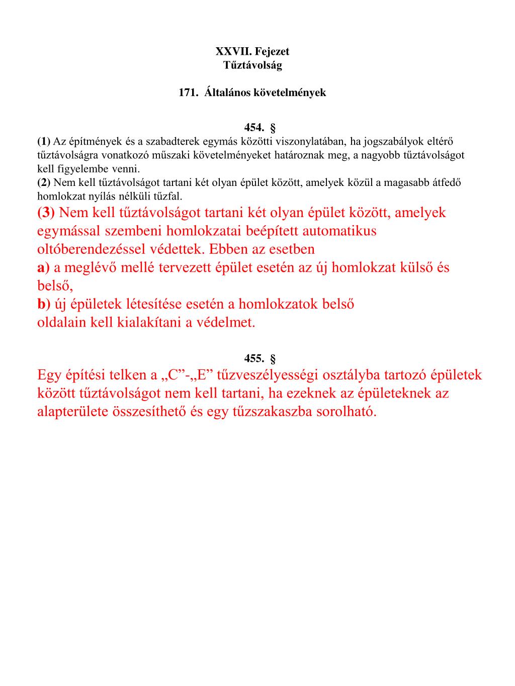 XXVII. Fejezet • Tűztávolság • 171. Általános követelmények • 454. § • (1) Az építmények és a szabadterek egymás közötti viszonylatában, ha jogszabályok eltérő tűztávolságra vonatkozó műszaki követelményeket határoznak meg, a nagyobb tűztávolságot kell figyelembe venni. • (2) Nem kell tűztávolságot tartani két olyan épület között, amelyek közül a magasabb átfedő homlokzat nyílás nélküli tűzfal. • (3) Nem kell tűztávolságot tartani két olyan épület között, amelyek egymással szembeni homlokzatai beépített automatikus oltóberendezéssel védettek. Ebben az esetben • a)a meglévő mellé tervezett épület esetén az új homlokzat külső és belső, • b) új épületek létesítése esetén a homlokzatok belső • oldalain kell kialakítani a védelmet. • 455. § • Egy építési telken a „C”-„E” tűzveszélyességi osztályba tartozó épületek között tűztávolságot nem kell tartani, ha ezeknek az épületeknek az alapterülete összesíthető és egy tűzszakaszba sorolható.