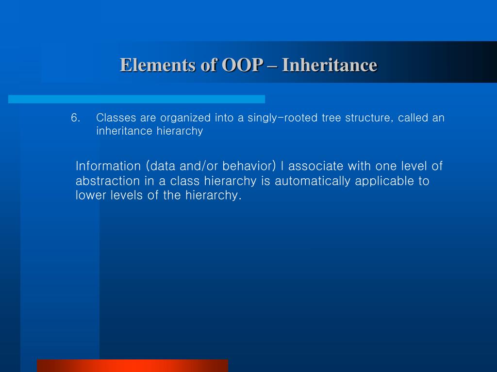 Elements of OOP – Inheritance 6. Classes are organized into a singly-rooted tree structure, called an inheritance hierarchy Information (data and/or behavior) I associate with one level of abstraction in a class hierarchy is automatically applicable to lower levels of the hierarchy.