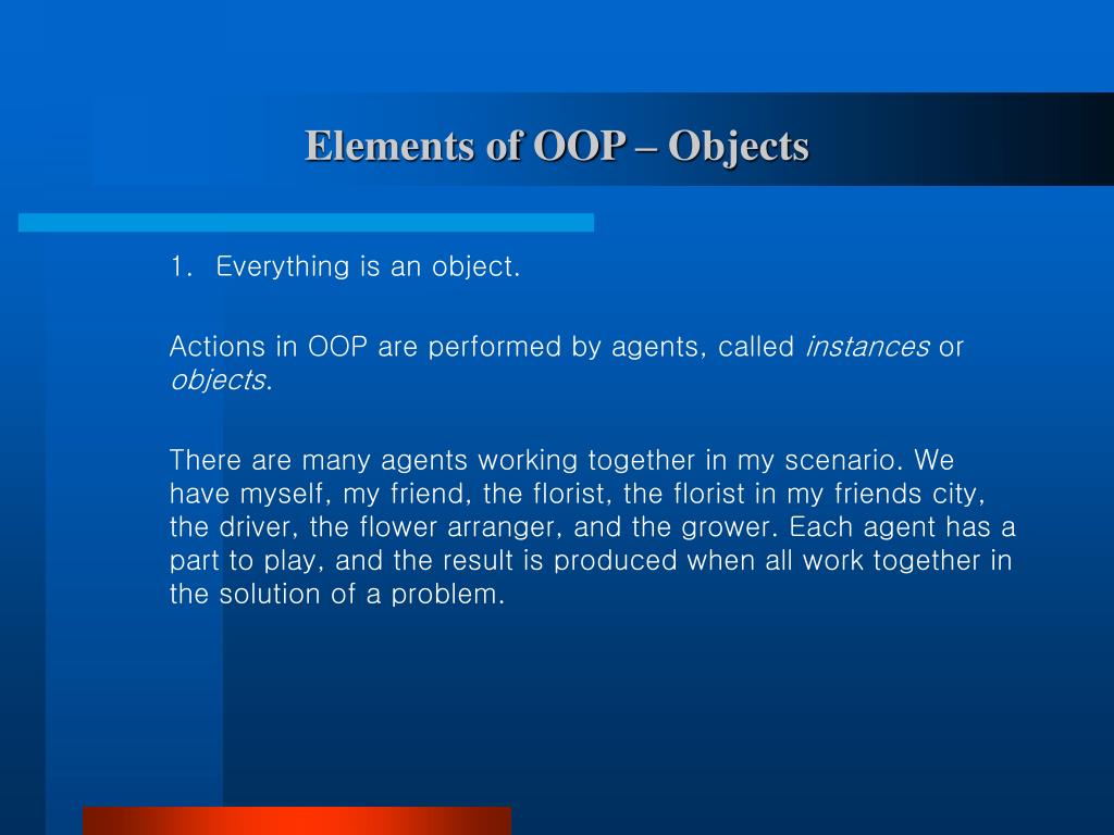 Elements of OOP – Objects 1. Everything is an object. Actions in OOP are performed by agents, called instances or objects. There are many agents working together in my scenario. We have myself, my friend, the florist, the florist in my friends city, the driver, the flower arranger, and the grower. Each agent has a part to play, and the result is produced when all work together in the solution of a problem.