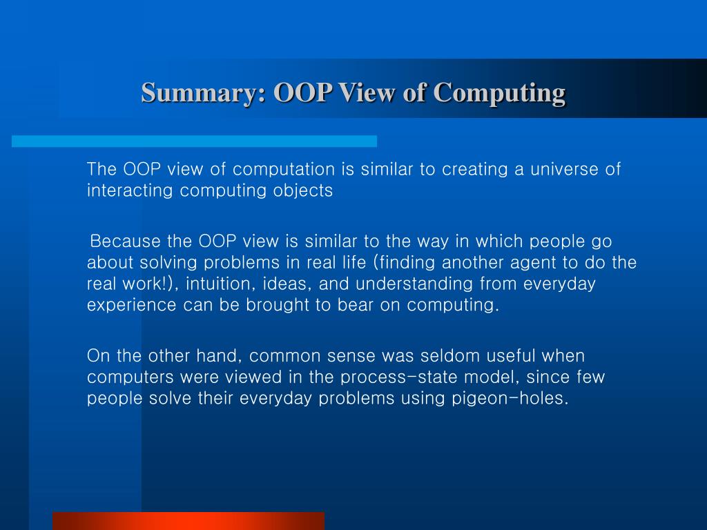 Summary: OOP View of Computing The OOP view of computation is similar to creating a universe of interacting computing objects Because the OOP view is similar to the way in which people go about solving problems in real life (finding another agent to do the real work!), intuition, ideas, and understanding from everyday experience can be brought to bear on computing. On the other hand, common sense was seldom useful when computers were viewed in the process-state model, since few people solve their everyday problems using pigeon-holes.
