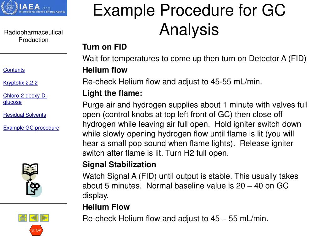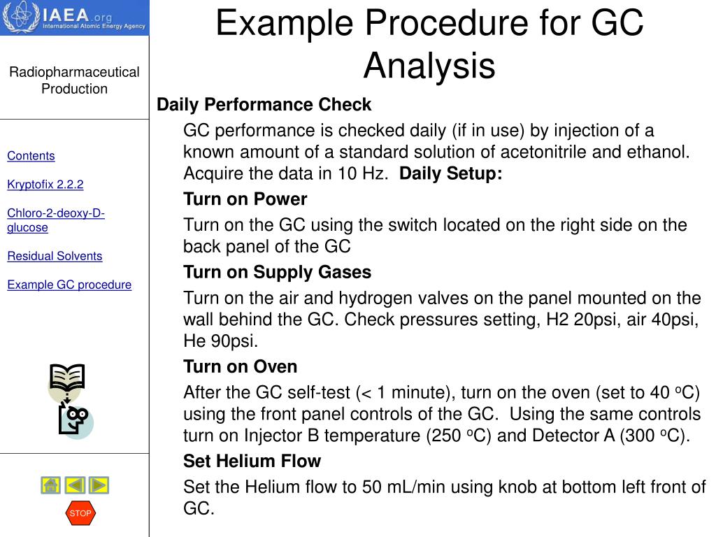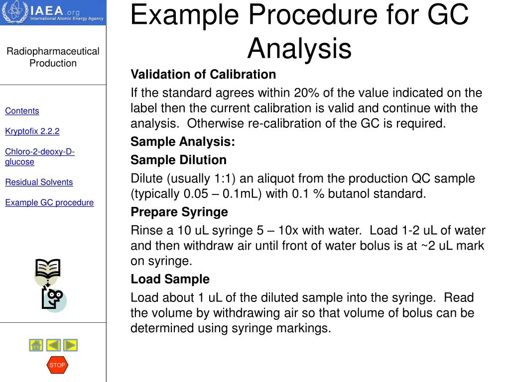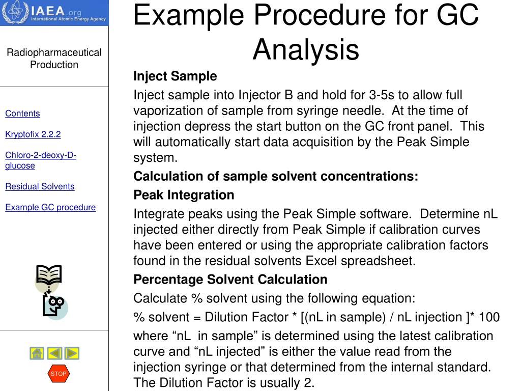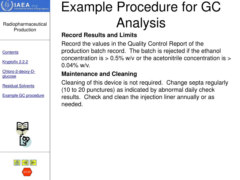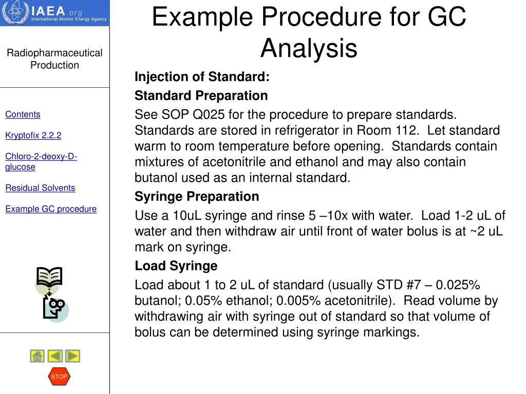 Chemical Purity Residual solvents STOP Discussion:Acetonitrile is used during synthesis, for reagent preparations and for conditioning of the purification cartridges. Traces of this organic solvent may potentially contaminate the FDG, and therefore, should be controlled. Only those solvents that may be present in the final preparation need to be analyzed (e.g. ethanol). When ethanol impurity in FDG is suspected, the quantity present can be measured using the same GC test method. The USP has set an upper limit of 0,5% ethanol per mL of FDG solution. Read an example Standard Operating Procedure for the analysis of residual solvents by GC. HERE To skip the procedure, hit the STOP sign
