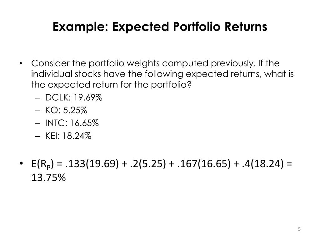 Example: Expected Portfolio Returns • Consider the portfolio weights computed previously. If the individual stocks have the following expected returns, what is the expected return for the portfolio? • DCLK: 19.69% • KO: 5.25% • INTC: 16.65% • KEI: 18.24% • E(RP) = .133(19.69) + .2(5.25) + .167(16.65) + .4(18.24) = 13.75%
