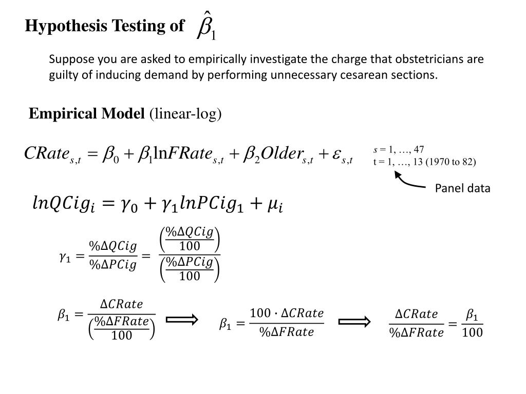 Hypothesis Testing of Suppose you are asked to empirically investigate the charge that obstetricians are guilty of inducing demand by performing unnecessary cesarean sections. Empirical Model (linear-log) s = 1, …, 47 t = 1, …, 13 (1970 to 82) Panel data