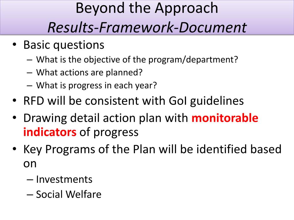 Beyond the ApproachResults-Framework-Document • Basic questions • What is the objective of the program/department? • What actions are planned? • What is progress in each year? • RFD will be consistent with GoI guidelines • Drawing detail action plan with monitorable indicators of progress • Key Programs of the Plan will be identified based on • Investments • Social Welfare