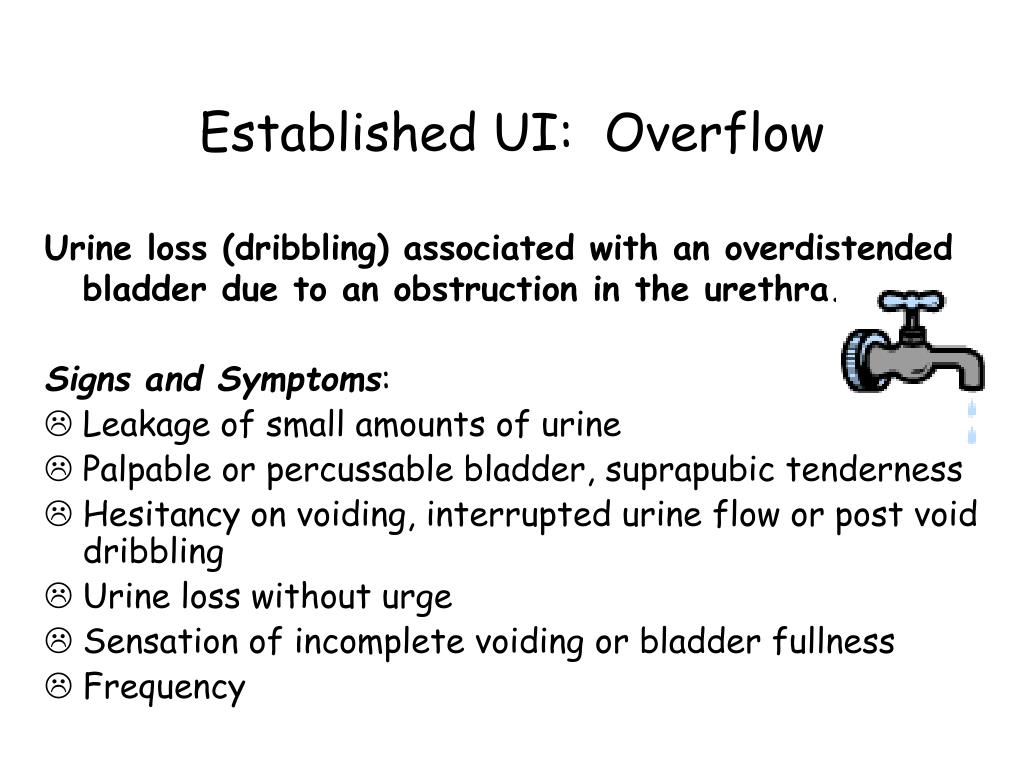 Established UI: Overflow Urine loss (dribbling) associated with an overdistended bladder due to an obstruction in the urethra. Signs and Symptoms: • Leakage of small amounts of urine • Palpable or percussable bladder, suprapubic tenderness • Hesitancy on voiding, interrupted urine flow or post void dribbling • Urine loss without urge • Sensation of incomplete voiding or bladder fullness • Frequency