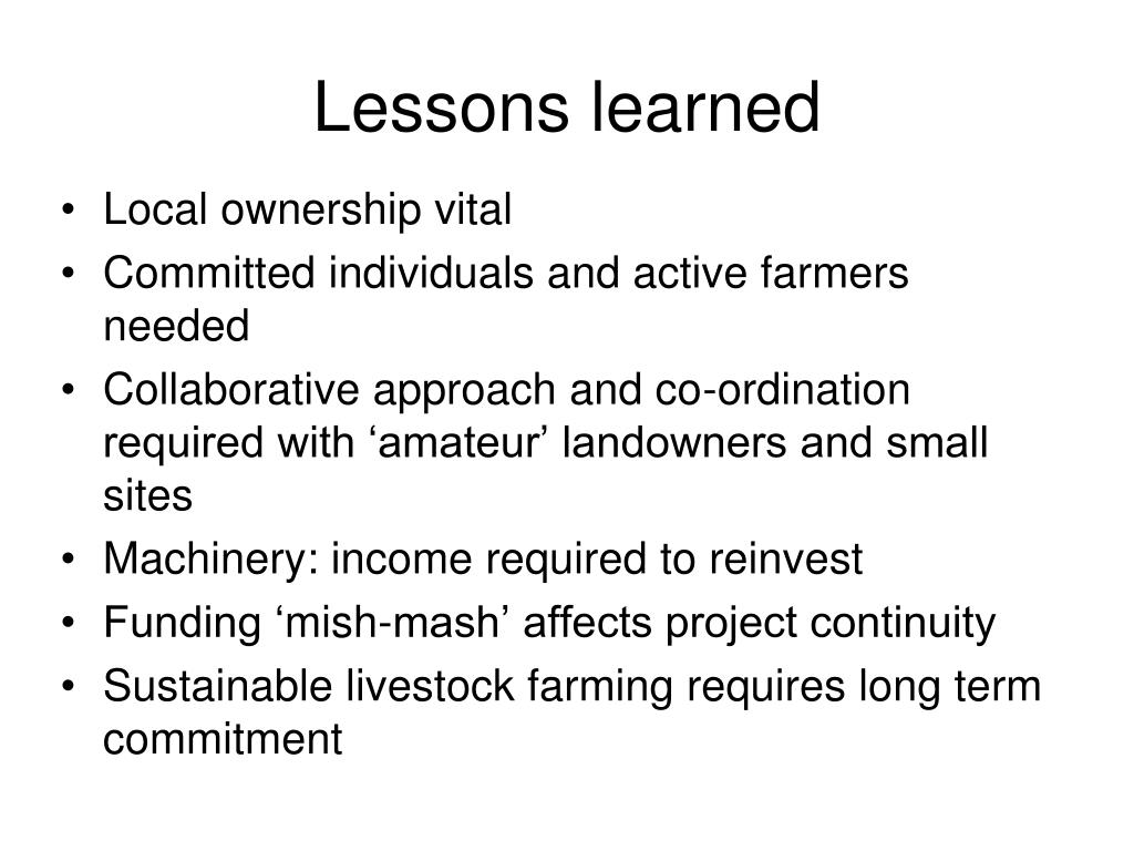 Lessons learned • Local ownership vital • Committed individuals and active farmers needed • Collaborative approach and co-ordination required with ‘amateur’ landowners and small sites • Machinery: income required to reinvest • Funding ‘mish-mash’ affects project continuity • Sustainable livestock farming requires long term commitment