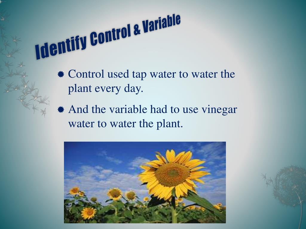 Identify Control & Variable • Control used tap water to water the plant every day. • And the variable had to use vinegar water to water the plant.