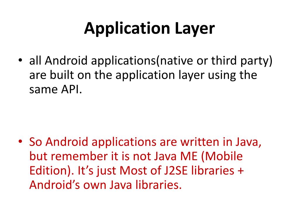 Application Layer • all Android applications(native or third party) are built on the application layer using the same API. • So Android applications are written in Java, but remember it is not Java ME (Mobile Edition). It’s just Most of J2SE libraries + Android’s own Java libraries.