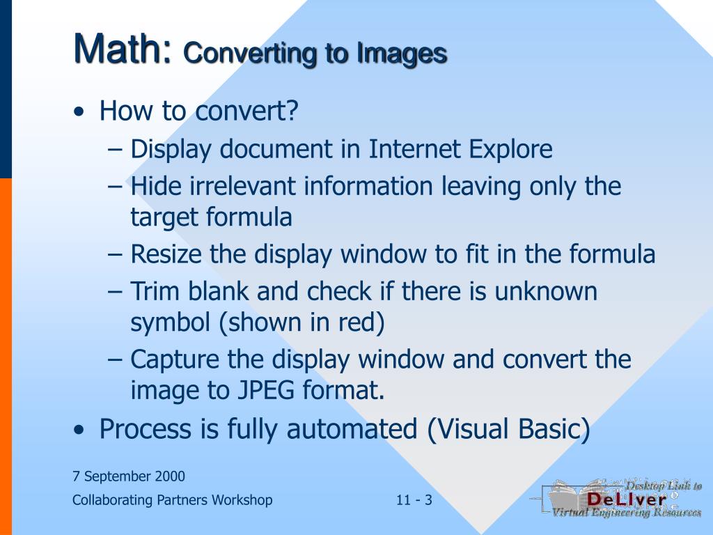 Math: Converting to Images • How to convert? • Display document in Internet Explore • Hide irrelevant information leaving only the target formula • Resize the display window to fit in the formula • Trim blank and check if there is unknown symbol (shown in red) • Capture the display window and convert the image to JPEG format. • Process is fully automated (Visual Basic) Collaborating Partners Workshop