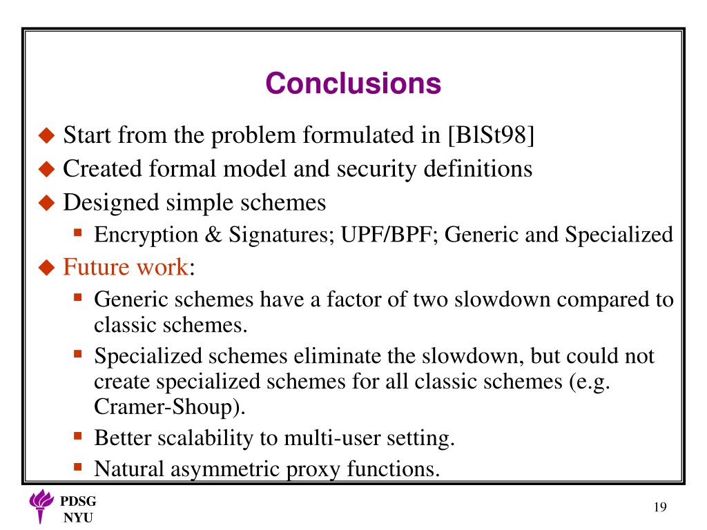 Conclusions • Start from the problem formulated in [BlSt98] • Created formal model and security definitions • Designed simple schemes • Encryption & Signatures; UPF/BPF; Generic and Specialized • Future work: • Generic schemes have a factor of two slowdown compared to classic schemes. • Specialized schemes eliminate the slowdown, but could not create specialized schemes for all classic schemes (e.g. Cramer-Shoup). • Better scalability to multi-user setting. • Natural asymmetric proxy functions.