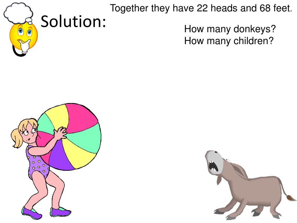 Together they have 22 heads and 68 feet. • How many donkeys? • How many children? Solution: