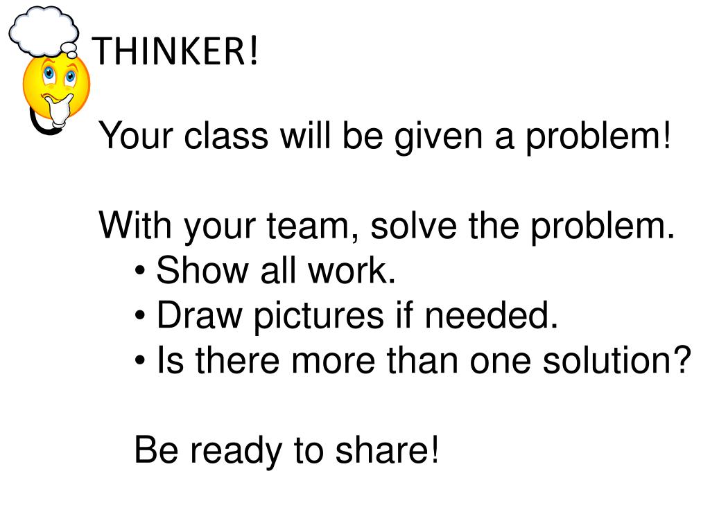 THINKER! Your class will be given a problem! With your team, solve the problem. • Show all work. • Draw pictures if needed. • Is there more than one solution? • Be ready to share!