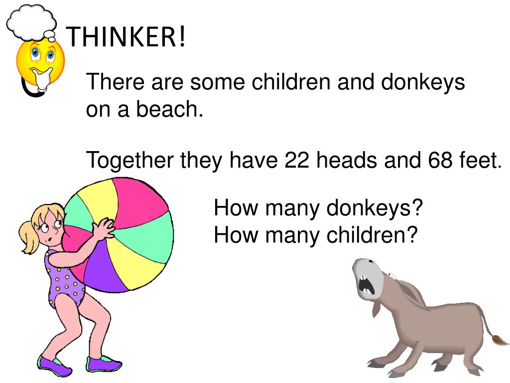 THINKER! There are some children and donkeys on a beach. • Together they have 22 heads and 68 feet. • How many donkeys? • How many children?