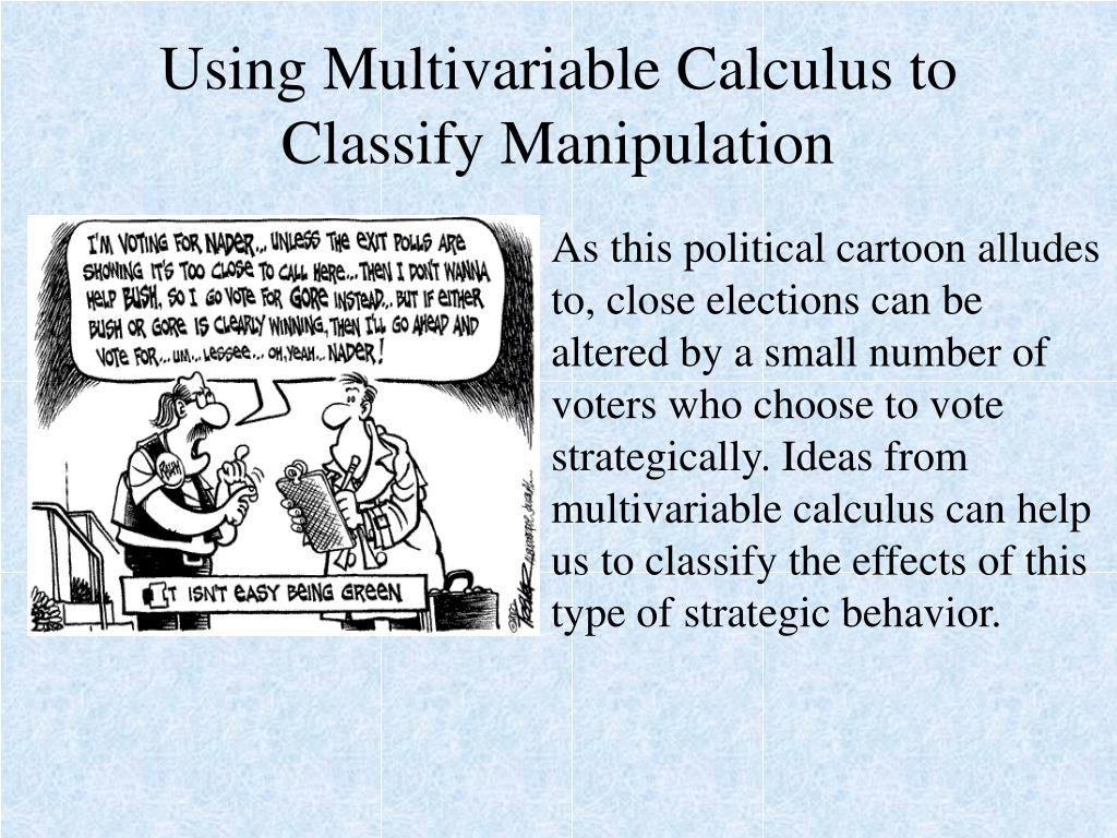 Using Multivariable Calculus to Classify Manipulation As this political cartoon alludes to, close elections can be altered by a small number of voters who choose to vote strategically. Ideas from multivariable calculus can help us to classify the effects of this type of strategic behavior.