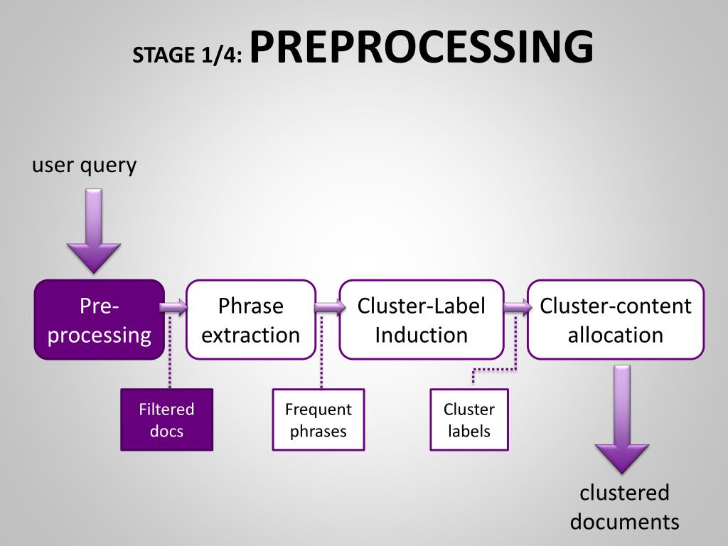 Stage 1/4: Preprocessing user query Pre-processing Phrase extraction Cluster-Label Induction Cluster-content allocation Filtered docs Frequent phrases Cluster labels clustered documents