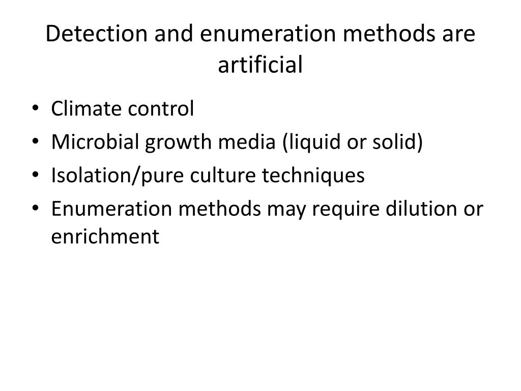 Detection and enumeration methods are artificial • Climate control • Microbial growth media (liquid or solid) • Isolation/pure culture techniques • Enumeration methods may require dilution or enrichment