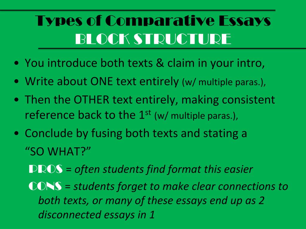 Types of Comparative EssaysBLOCK STRUCTURE • You introduce both texts & claim in your intro, • Write about ONE text entirely (w/ multiple paras.), • Then the OTHER text entirely, making consistent reference back to the 1st(w/ multiple paras.), • Conclude by fusing both texts and stating a “SO WHAT?” PROS= often students find format this easier CONS = students forget to make clear connections to both texts, or many of these essays end up as 2 disconnected essays in 1