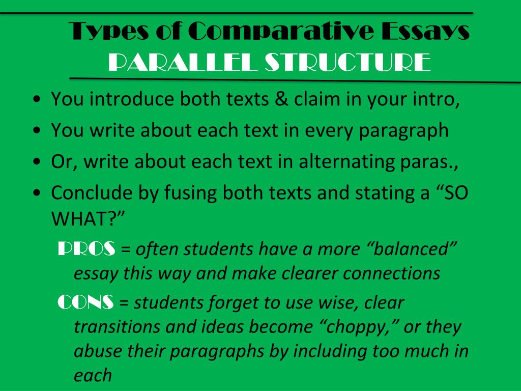 Types of Comparative EssaysPARALLEL STRUCTURE • You introduce both texts & claim in your intro, • You write about each text in every paragraph • Or, write about each text in alternating paras., • Conclude by fusing both texts and stating a “SO WHAT?” PROS= often students have a more “balanced” essay this way and make clearer connections CONS= students forget to use wise, clear transitions and ideas become “choppy,” or they abuse their paragraphs by including too much in each
