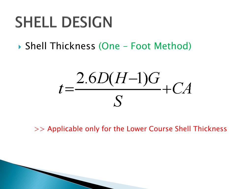 SHELL DESIGN • Shell Thickness (One – Foot Method) >> Applicable only for the Upper Course Shell Thickness