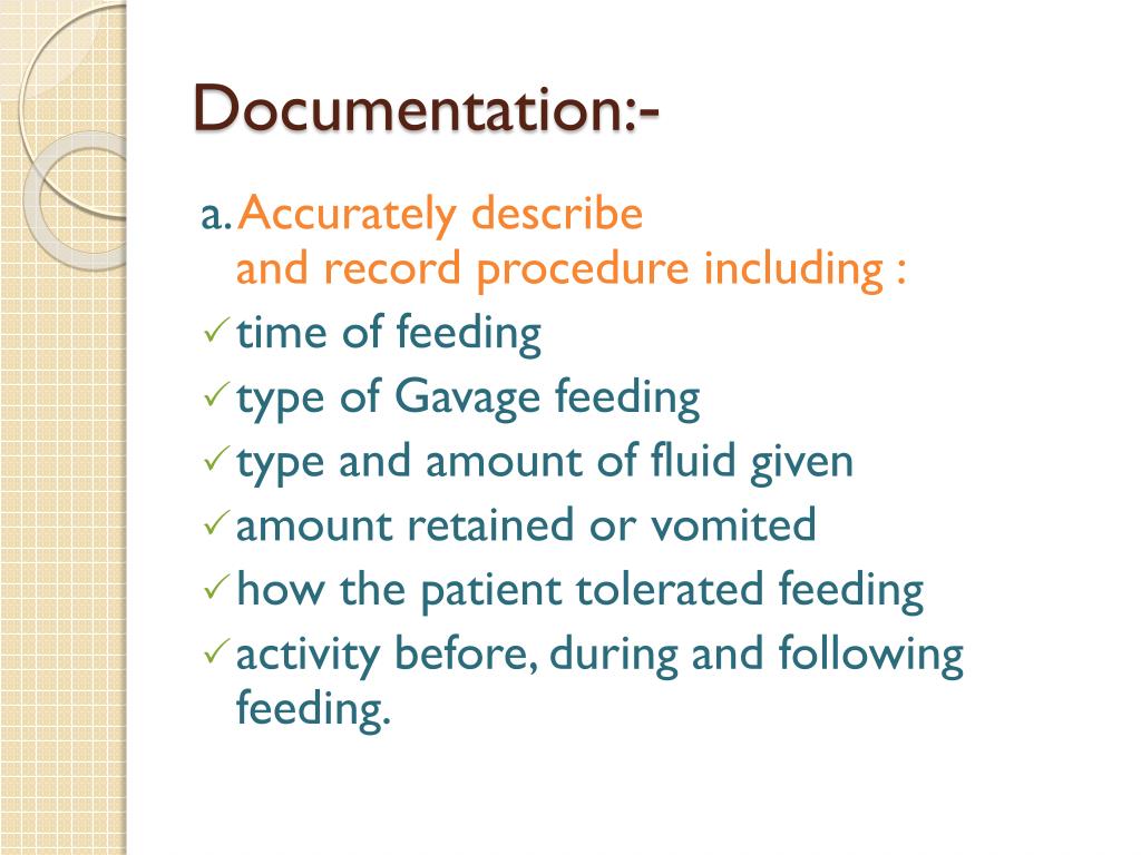 -Documentation: a. Accurately describe and record procedure including : • time of feeding • type of Gavage feeding • type and amount of fluid given • amount retained or vomited • how the patient tolerated feeding • activity before, during and following feeding.