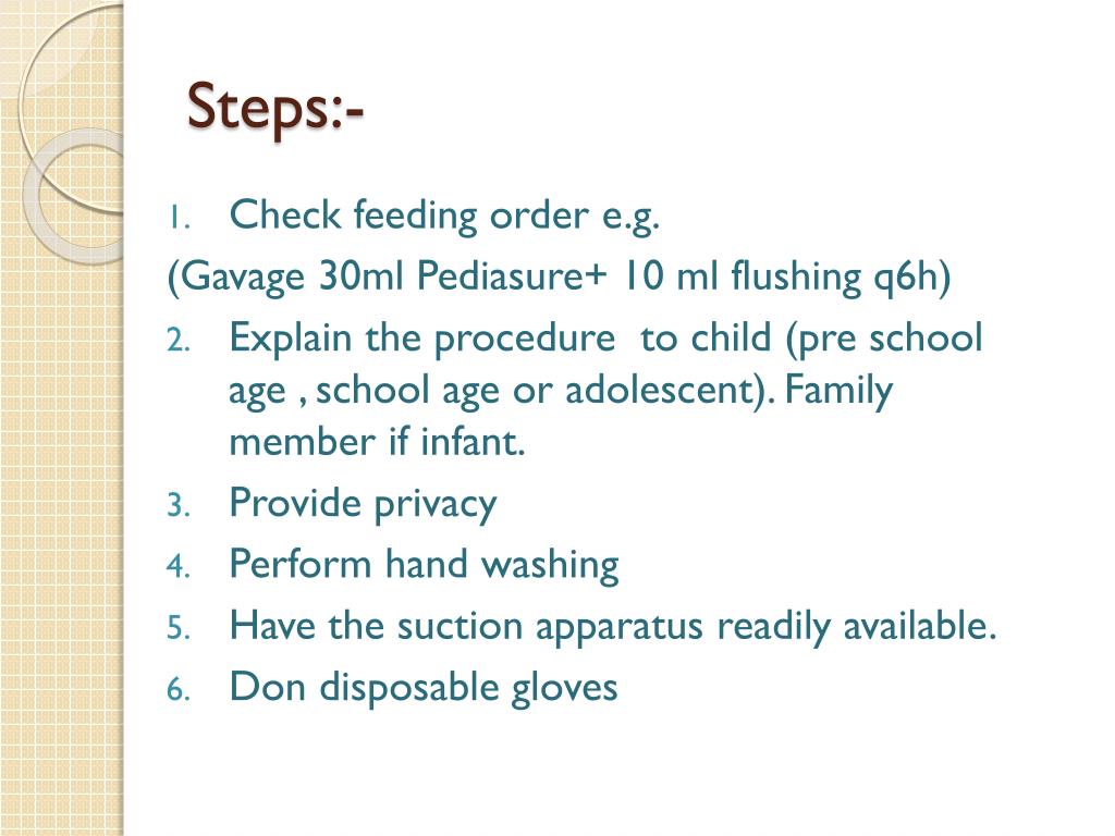 Steps:- • Check feeding order e.g. (Gavage 30ml Pediasure+ 10 ml flushing q6h) • Explain the procedure to child (pre school age , school age or adolescent). Family member if infant. • Provide privacy • Perform hand washing • Have the suction apparatus readily available. • Don disposable gloves