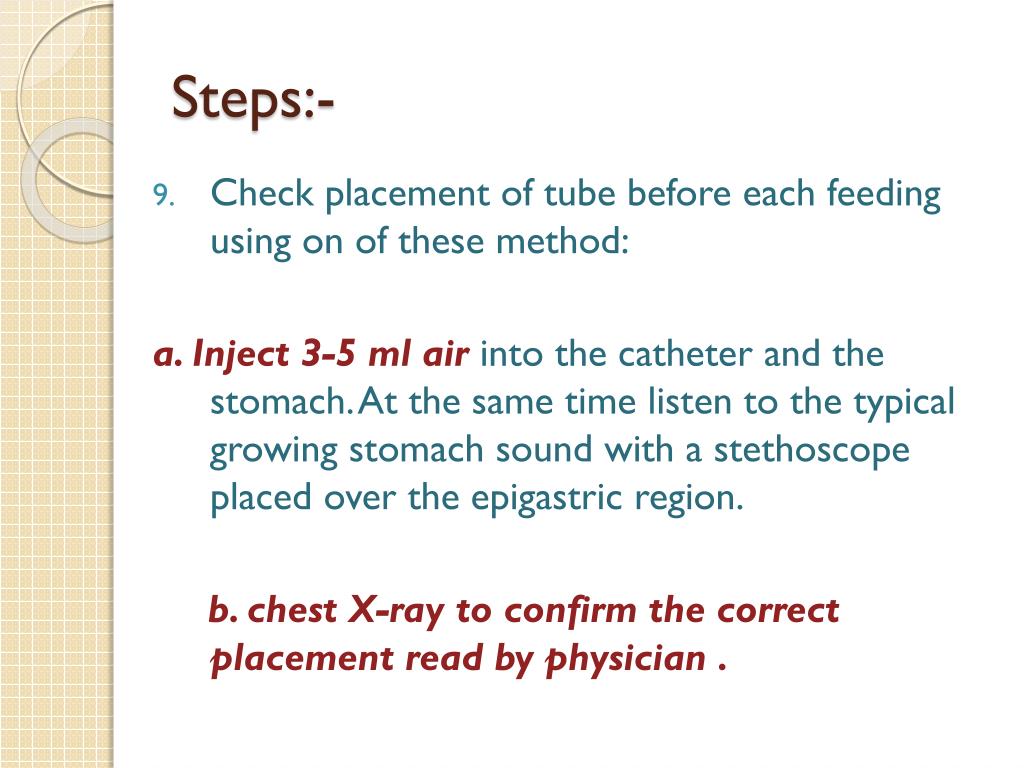 Steps:- • Check placement of tube before each feeding using on of these method: a. Inject 3-5 ml air into the catheter and the stomach. At the same time listen to the typical growing stomach sound with a stethoscope placed over the epigastric region. b. chest X-ray to confirm the correct placement read by physician .