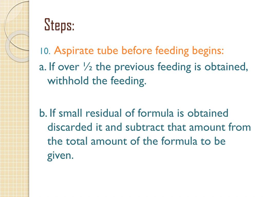 Steps: • Aspirate tube before feeding begins: a. If over ½ the previous feeding is obtained, withhold the feeding. b. If small residual of formula is obtained discarded it and subtract that amount from the total amount of the formula to be given.