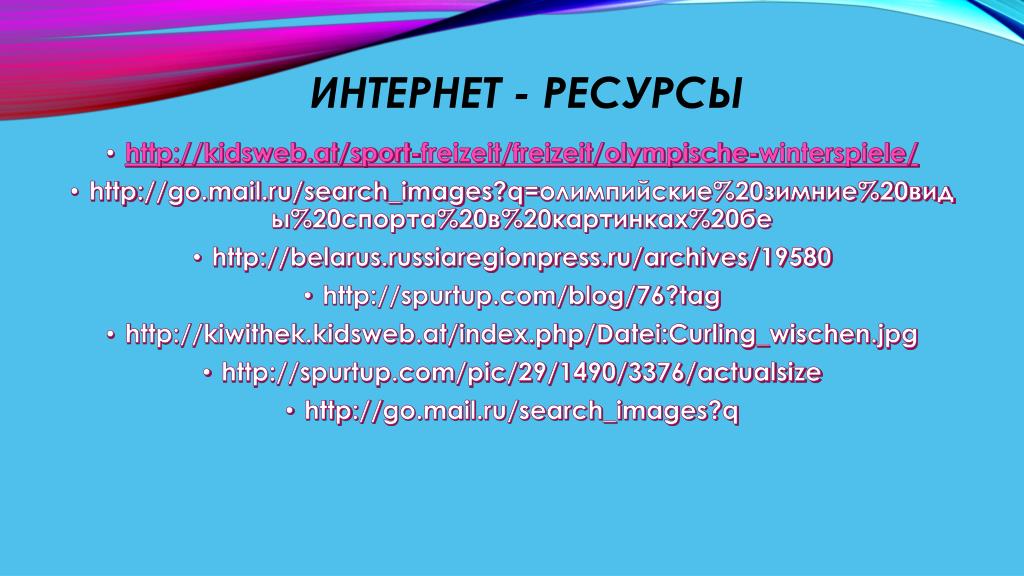 ИНТЕРНЕТ - РЕСУРСЫ • http://kidsweb.at/sport-freizeit/freizeit/olympische-winterspiele/ • http://go.mail.ru/search_images?q=олимпийские%20зимние%20виды%20спорта%20в%20картинках%20бе • http://belarus.russiaregionpress.ru/archives/19580 • http://spurtup.com/blog/76?tag • http://kiwithek.kidsweb.at/index.php/Datei:Curling_wischen.jpg • http://spurtup.com/pic/29/1490/3376/actualsize • http://go.mail.ru/search_images?q