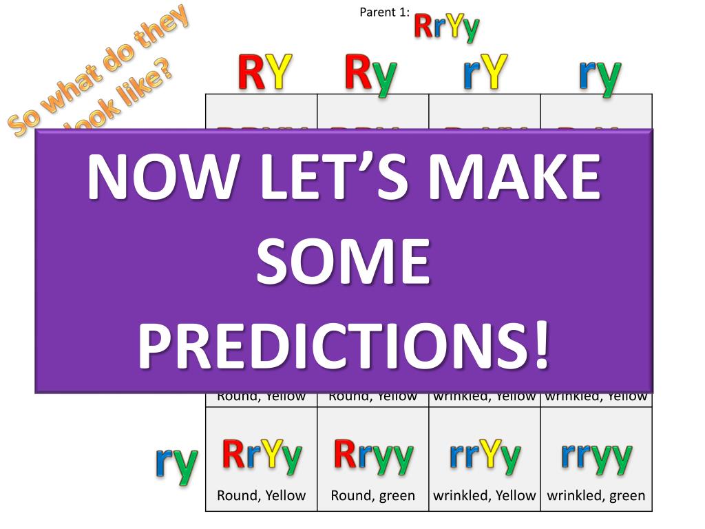 Parent 1: RrYy RY Ry rY ry So what do they look like? RY RRYY RRYy RrYY RrYy NOW LET’S MAKE SOME PREDICTIONS! Round, Yellow Round, Yellow Round, Yellow Round, Yellow Ry RRYy RRyy RrYy Rryy RrYy Round, Yellow Round, green Round, Yellow Round, green Parent 2: rY RrYY RrYy rrYY rrYy Round, Yellow Round, Yellow wrinkled, Yellow wrinkled, Yellow ry RrYy Rryy rrYy rryy Round, Yellow Round, green wrinkled, Yellow wrinkled, green