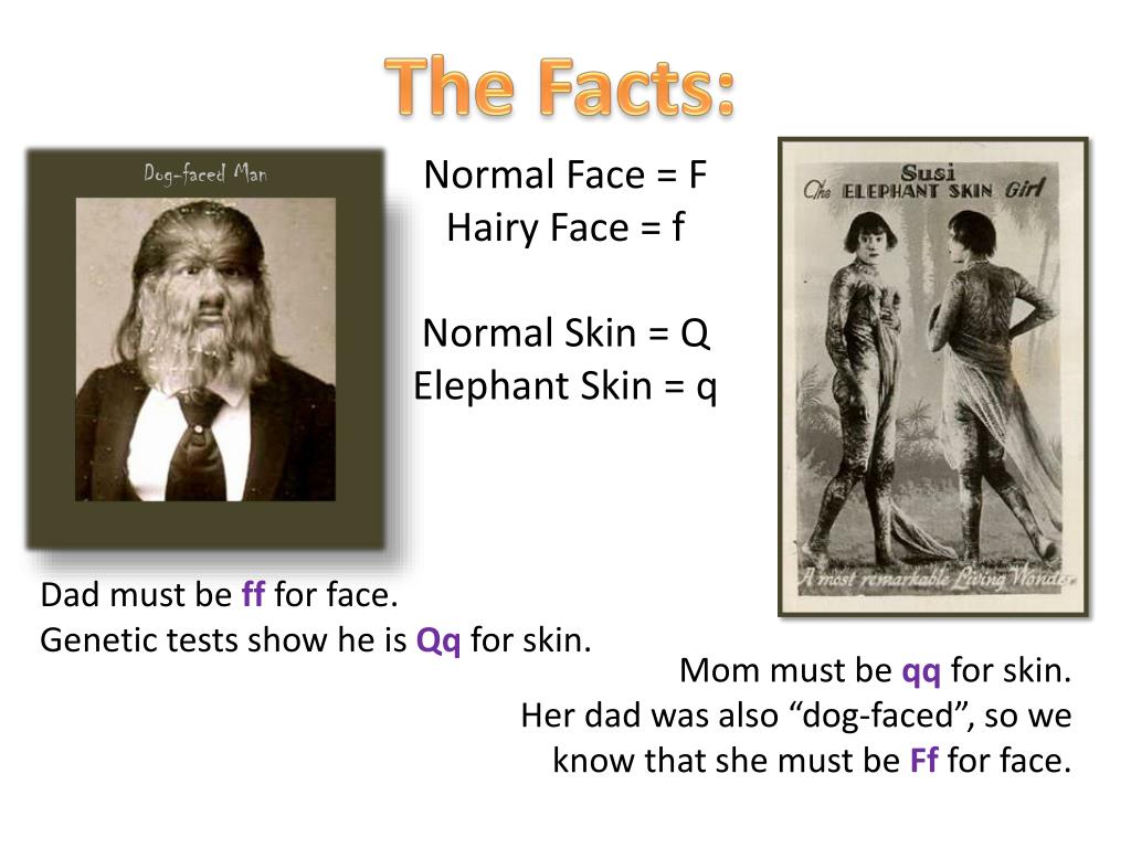 The Facts: Normal Face = F Hairy Face = f Normal Skin = Q Elephant Skin = q Dog-faced Man Dad must be fffor face. Genetic tests show he is Qq for skin. Mom must be qq for skin. Her dad was also “dog-faced”, so we know that she must be Ff for face.