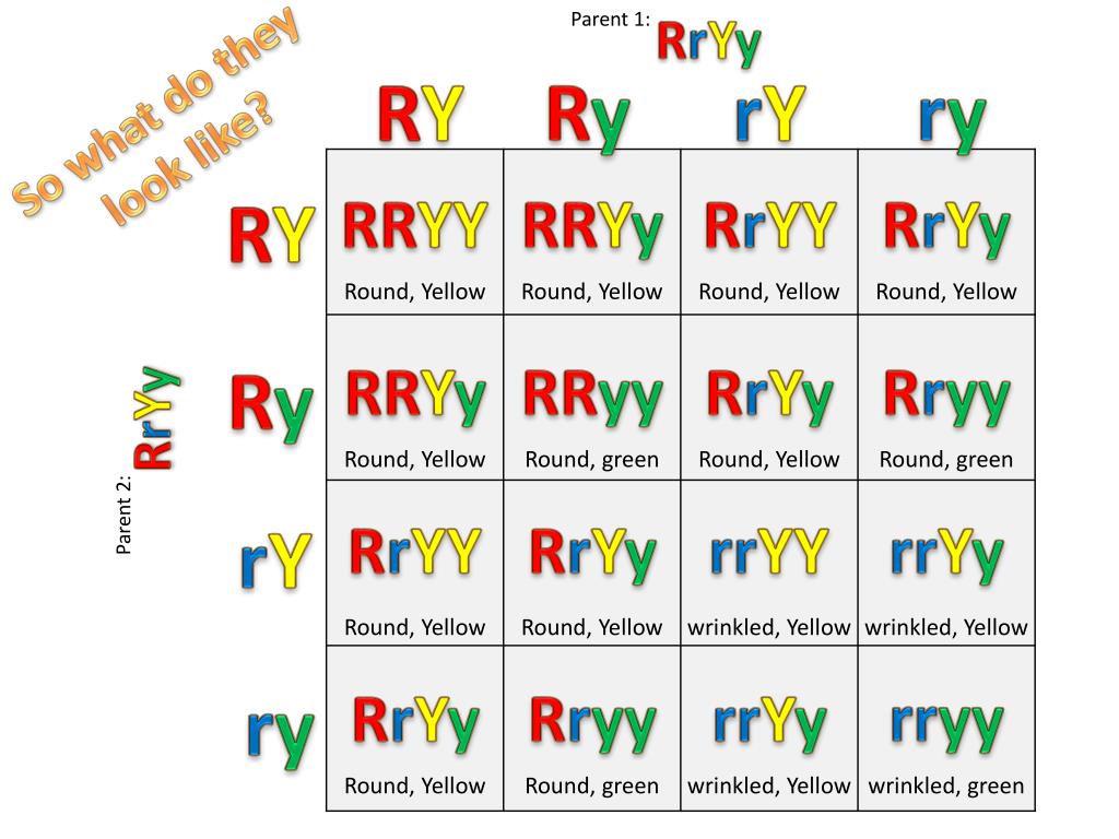 Parent 1: RrYy RY Ry rY ry So what do they look like? RY RRYY RRYy RrYY RrYy Round, Yellow Round, Yellow Round, Yellow Round, Yellow Ry RRYy RRyy RrYy Rryy RrYy Round, Yellow Round, green Round, Yellow Round, green Parent 2: rY RrYY RrYy rrYY rrYy Round, Yellow Round, Yellow wrinkled, Yellow wrinkled, Yellow ry RrYy Rryy rrYy rryy Round, Yellow Round, green wrinkled, Yellow wrinkled, green