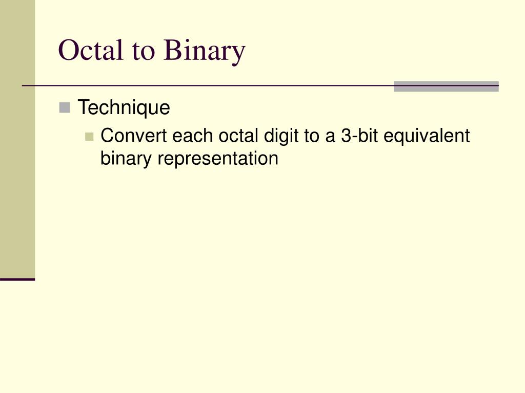 Octal to Binary Technique Convert each octal digit to a 3-bit equivalent binary representation