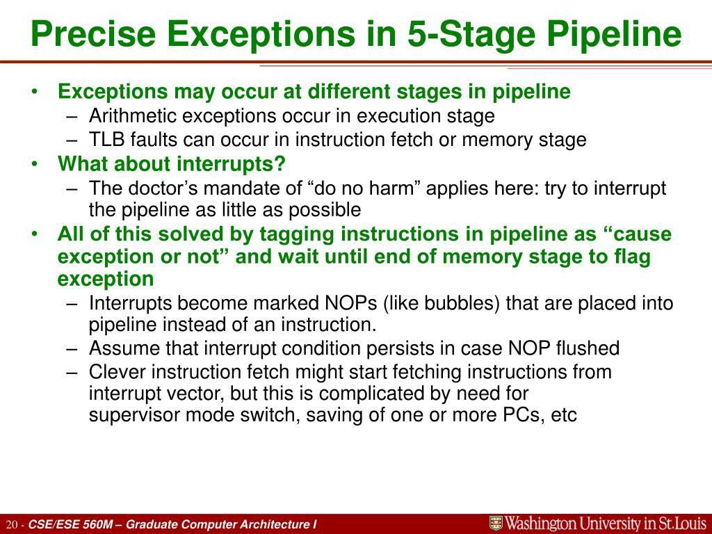 Precise Exceptions in 5-Stage Pipeline • Exceptions may occur at different stages in pipeline • Arithmetic exceptions occur in execution stage • TLB faults can occur in instruction fetch or memory stage • What about interrupts? • The doctor’s mandate of “do no harm” applies here: try to interrupt the pipeline as little as possible • All of this solved by tagging instructions in pipeline as “cause exception or not” and wait until end of memory stage to flag exception • Interrupts become marked NOPs (like bubbles) that are placed into pipeline instead of an instruction. • Assume that interrupt condition persists in case NOP flushed • Clever instruction fetch might start fetching instructions from interrupt vector, but this is complicated by need forsupervisor mode switch, saving of one or more PCs, etc