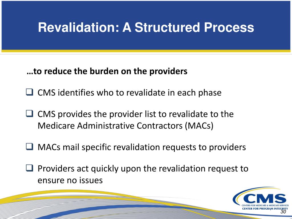 Revalidation: A Structured Process …to reduce the burden on the providers • CMS identifies who to revalidate in each phase • CMS provides the provider list to revalidate to the Medicare Administrative Contractors (MACs) • MACs mail specific revalidation requests to providers • Providers act quickly upon the revalidation request to ensure no issues