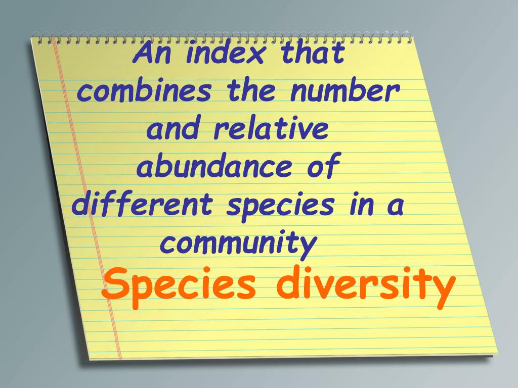 An index that combines the number and relative abundance of different species in a community Species diversity