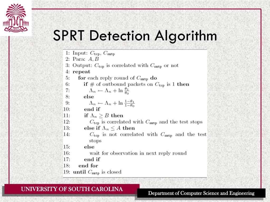 Design of Spam Laundering Detection • With proxy-based spam transmission, number of incoming SMTP reply packets = number of outgoing TCP packets • Possible for this to occur with normal traffic, but very seldom • Sequential Probability Ratio Test (SPRT) is used