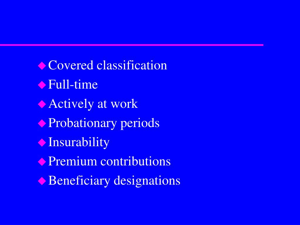 Covered classification • Full-time • Actively at work • Probationary periods • Insurability • Premium contributions • Beneficiary designations